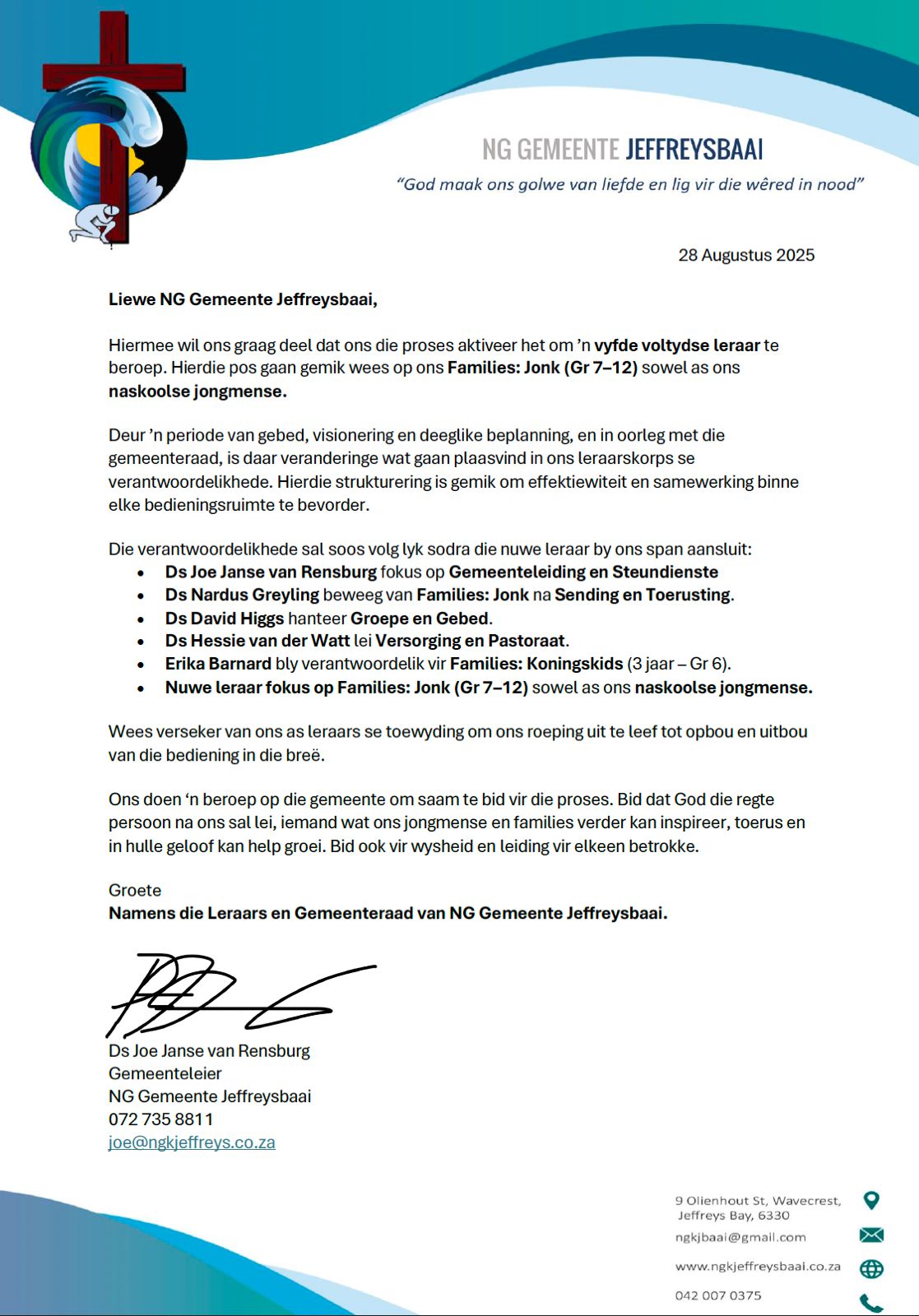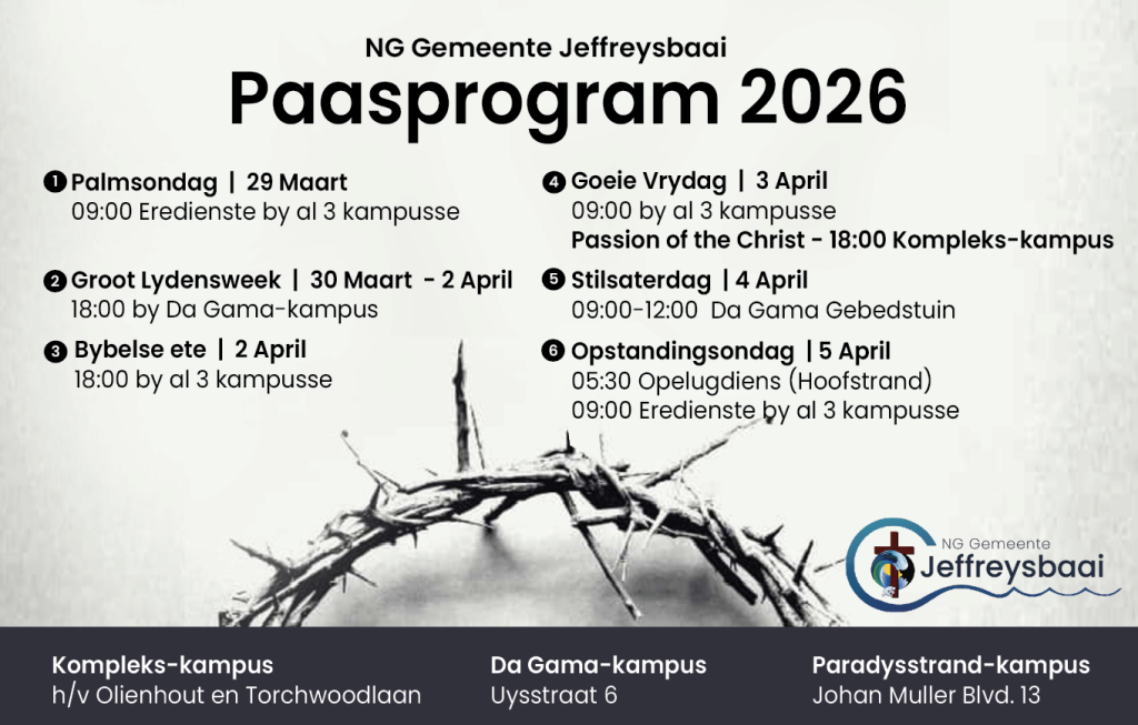 Informele erediens – 9:00 Kinderbediening – 9:00 JONK diens (Tieners, jongmense en ouers) - 18:00
